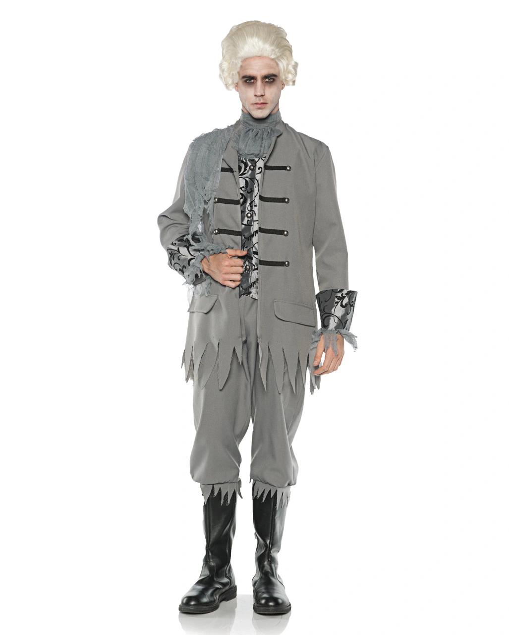 Das Edelmann Geister Kostüm besteht aus Jacke, Hose und Jabot. Schnitt und Stil der Halloween-Verkleidung sind den Bekleidungen der Adligen der Renaissance nachemfunden: Eine schneidige, an eine Uniform erinnernde Kostümjacke mit zwei doppelreihigen Knopfleisten und angenähter silberner Weste geht über in ein graues Beinkleid. Das Jabot unterstreicht den noblen Stil der Geisterbaron-Verkleidung. Mehrere gezackte Risse an den Säumen des Halloween-Kostüms sorgen für einen abgetragenen, eines adligen Gespenstes würdigen Look. Dazu passen die Barock Herrenperücke mit Zopf weiß und das Geister Make-up Set 7-teilig.