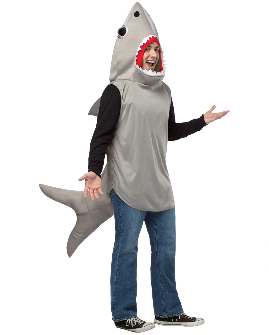 Das Hai Tierkostüm ist natürlich auch ein genial witziges Kostüm für den Fasching. Schließlich bist du in der Hai Verkleidung ein echter Eyecatcher. Du siehst aus wie die furchterregendste Kreatur im Meer und bist doch ein gern gesehener Gast auf der Motto Party. Die hellgraue Polyschaum Tunika hat eine Rückenflosse auf der Rückseite und eine Schwanzflosse an der Unterseite. Dein Gesicht ist in der Mundöffnung mit weißen gezackten Zähnen umrandet. Damit hast du alles im Blick.